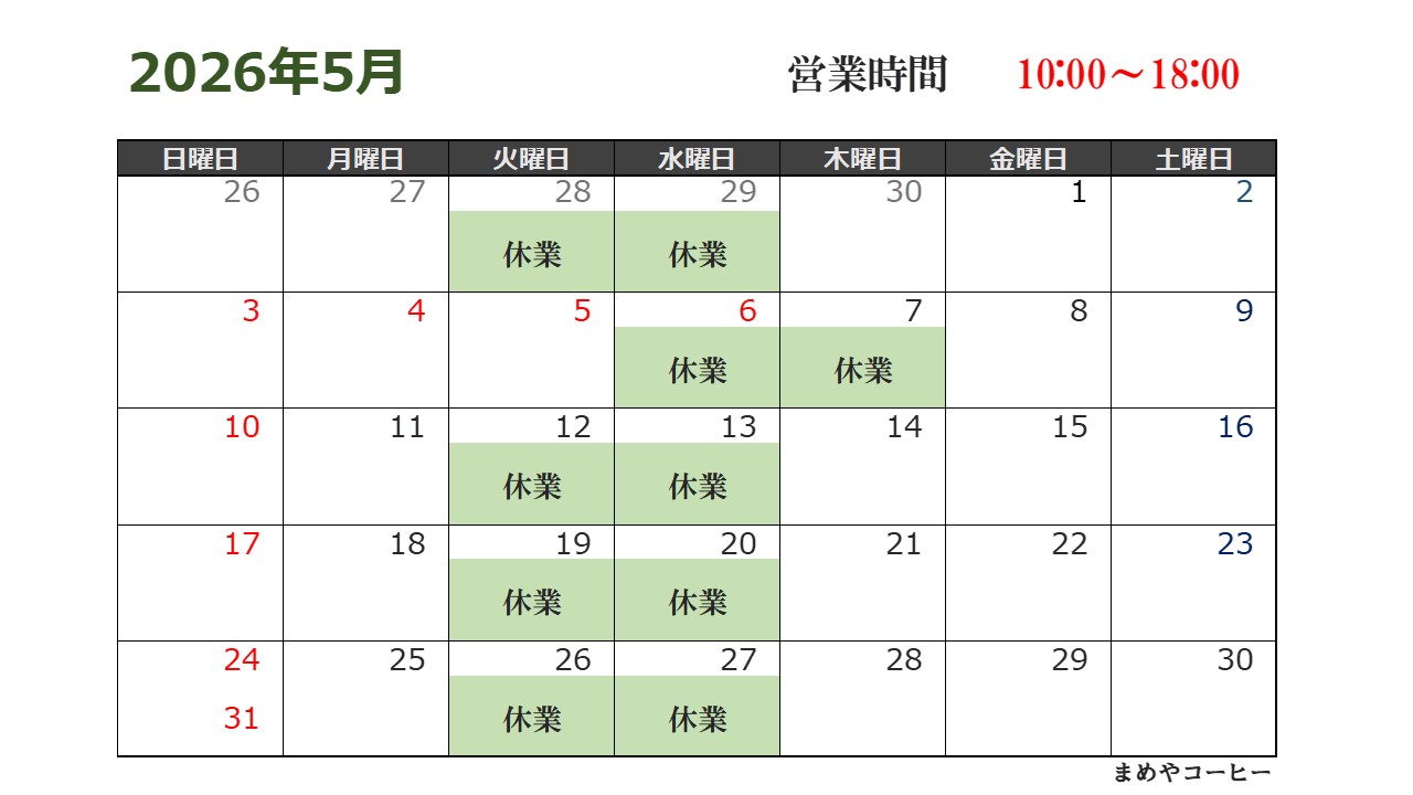 業務用焙煎・店内作業等のため火曜水曜は店舗を休業いたします。